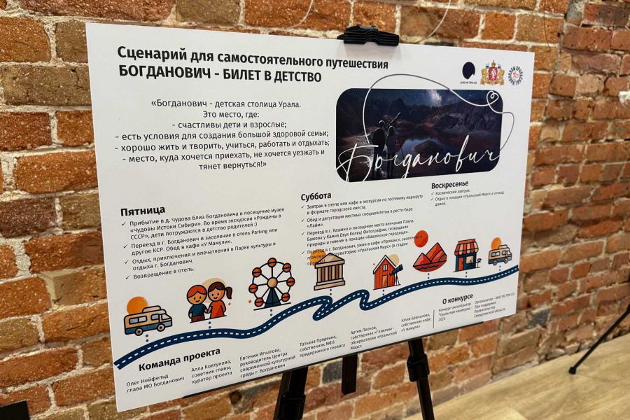 Первое место в номинации для самостоятельных путешествий занял маршрут «Билет в детство» из Богдановича. Глава муниципалитета и руководитель проекта Олег Нейфельд назвал Богданович детской столицей Урала и отметил, что там уже реализуется концепция города для детства, а также инвестиционный проект «Уральский марс».