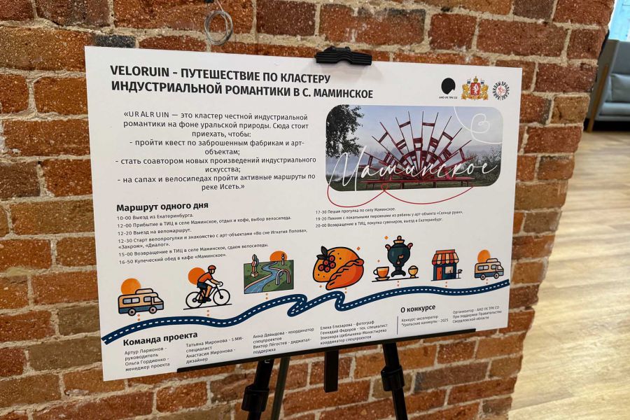 Члены жюри высоко оценили сценарий для отдыха Veloruin. Маршрут предлагает путешествие по кластеру индустриальной романтики в село Маминское Каменского муниципального округа. Руководитель проекта Артур Ларионов и его команда подготовили квест по заброшенным фабрикам и арт-объектам, прогулки на сапах по реке Исеть, а также мастер-классы по созданию произведений индустриального искусства.