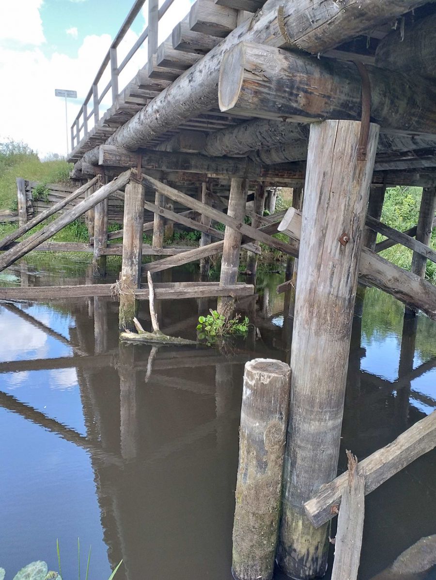 Сегодня старый деревянный мост демонтирован, а территория вокруг него рекультивирована. Для устройства насыпи понадобилось 16,2 тысячи кубометров грунта со щебёночно-песчаной смесью. Откосы укреплены георешёткой, геотекстилем и засеяны травой.
