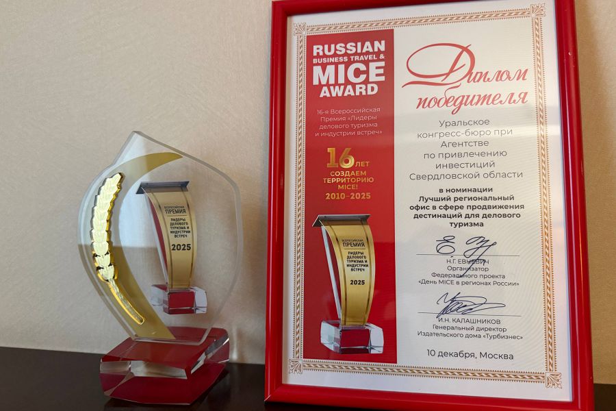 Уральское конгресс-бюро при Агентстве по привлечению инвестиций Свердловской области признано лучшим региональным офисом в продвижении дестинаций делового туризма. Награда вручена на ежегодной церемонии Russian Business Travel & MICE Award за высокий уровень поддержки отрасли и создание наиболее привлекательных условий для проведения в Свердловской области деловых мероприятий любого формата и уровня.