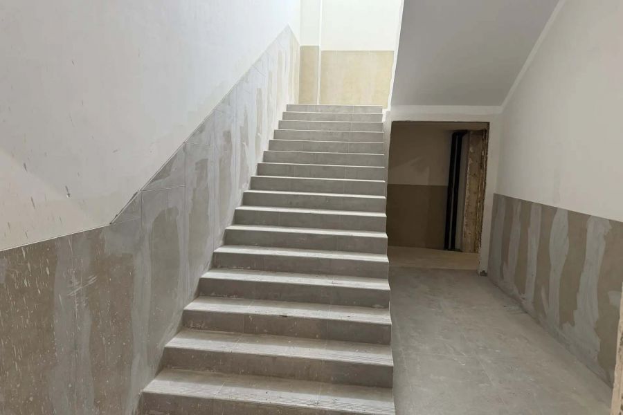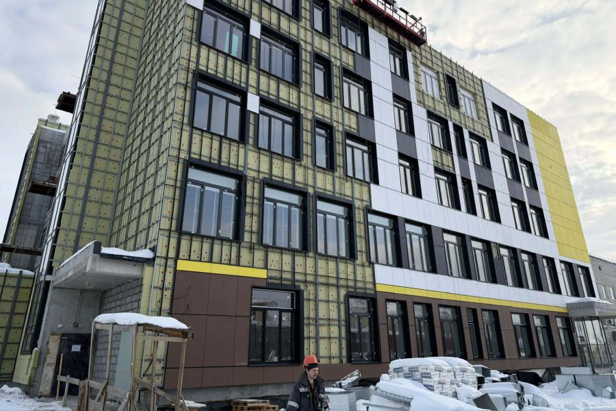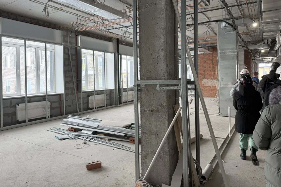 Завершается работа над окнами и витражами. Готовность фасада составляет 82%. Монтаж внутренних инженерных сетей также близок к завершению: водоснабжение и канализация готовы на 78%, отопление и вентиляция — на 86%.
