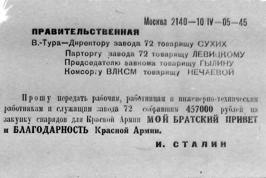 В 1945 г. «Правительственной телеграммой», верховный главнокомандующий, выносил благодарность коллективу завода за то что, трудящиеся из собственных средств собрали 457000 руб. для закупки боеприпасов для Красной армии.
